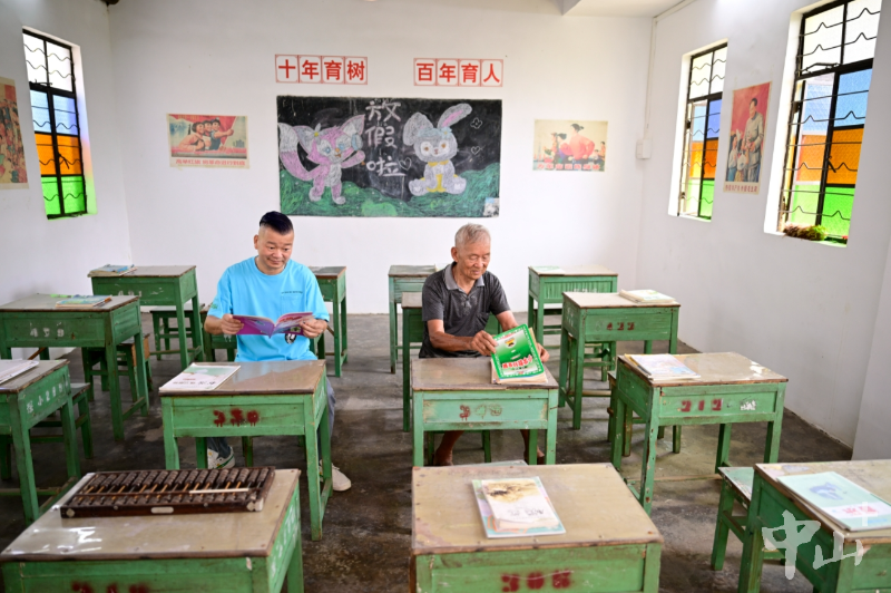 车神光和父亲坐在沙冈学校的“教室”里,回忆当年读书的情景