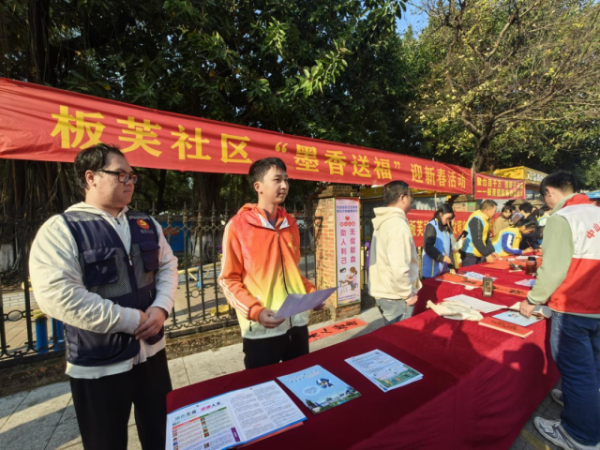 为传承中华优秀传统文化,丰富社区居民文化生活,营造喜气洋洋、积极向上的节日氛围,1月20日,我镇党群服务中心、总工会、团委、妇联、武装部、退军中心、平安法治办等联合板芙社区、中山市个私总会板芙分会、中国移动板芙分公司以及大学生青年志愿者协会,开展写春联送祝福活动,将喜气吉祥和美好祝福融入笔尖、化在纸上送给广大群众。
