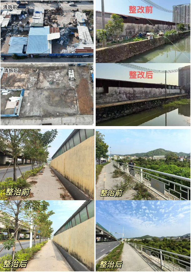 金钟村委会北侧河涌,岸线杂物被移除,新植灌木和草皮,“一河两岸”风貌带逐步呈现。