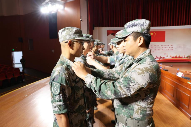 会场上,退出民兵组织的老兵卸下肩章光荣退队,老兵为新入队民兵佩戴肩章完成使命交接。