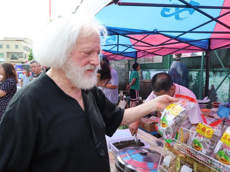 旅居中山的德国书画艺术家戈飞在集市挑选中山非遗产品。黄标 摄