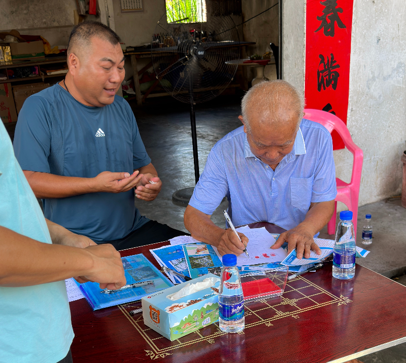 6月22日,一场大雨之后,白溪村白溪五队的一棵龙眼树下,前来表决的村民聚集在一起,依次有序在表决表上签名并按下红指印。一位村民告诉记者,经过前期的参观考察,他坚定了支持“工改”的决心。