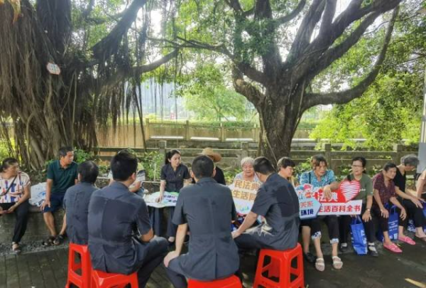 三乡法庭法官在板芙镇里溪村榕树下贴近群众普法