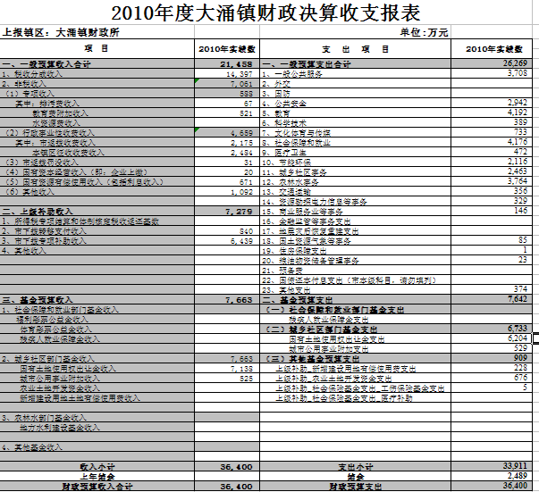 2010年我镇财政总收入3.64亿元,完成102%,同比增长78%;财政总支出3.3911亿元,完成94%,同比增长56%,结余2489万元。