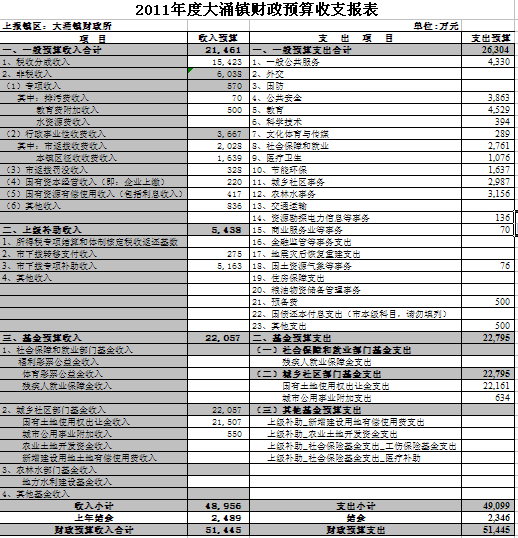 2011年我镇可用财力(含上年结余)5.1445亿元,其中:当年财政收入4.8956亿元;财政总支出4.9099亿元,结余2346万元。