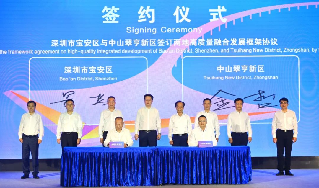 会上,宝安区与翠亨新区签订两地高质量融合发展框架协议,深圳市交通运输局与中山市交通运输局签订交通一体化协议,宝安九围国际总部区、翠亨深中合作产业园作了推介。