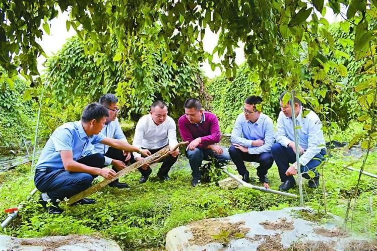 图为工作队与技术人员研究淮山种植技术。