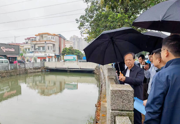 冒着绵绵阴雨,郭文海来到黄圃镇新地村鳗埒涌,检查督导文明围流域施工治理情况。