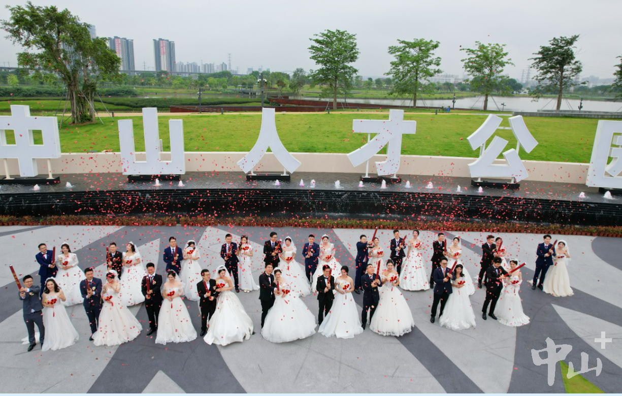 2024年5月20日,缘定中深人才集体婚礼在中山盛大举行,新人将彩纸向空中发放。(资料图片)记者 余兆宇 摄