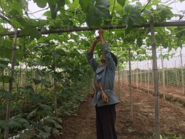 (农户 范阿姨:夏天就收成,我们这里就是水瓜有收成,摘完水瓜就准备种花菜。(现在)不种东西了,水瓜可以收成到农历七月,八月份把瓜棚收了,因为长久了瓜没那么好就会把瓜棚收了。)