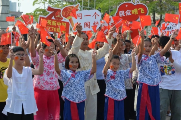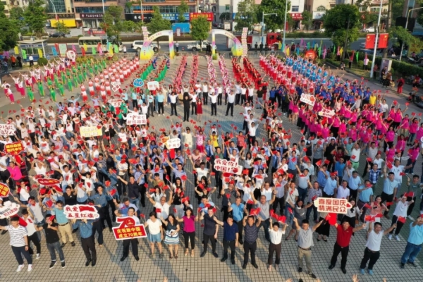 9月25日下午,民众镇举行了一场爱国快闪活动,来自镇机关30个部门的工作人员及民众镇各村(社区)的19支广场舞表演队伍近千人齐聚镇文化广场,大家载歌载舞,向新中国成立70周年献礼。