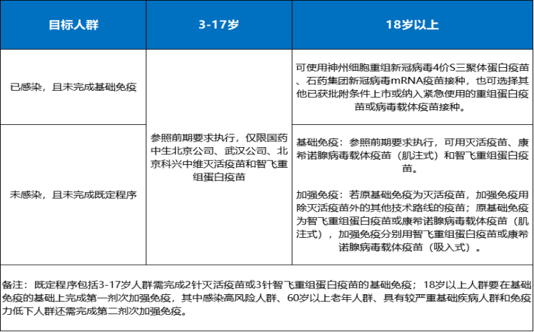 1.已感染,且未完成基础免疫的人群,感染3个月后再接种1剂次疫苗即可。2.未感染,且未完成既定程序的人群,继续完成后续剂次的疫苗接种。其中完成基础免疫的18岁以上人群,第一剂次加强免疫时间间隔从原来的6个月调整为3个月以上;第二剂次加强免疫时间间隔仍为6个月以上。