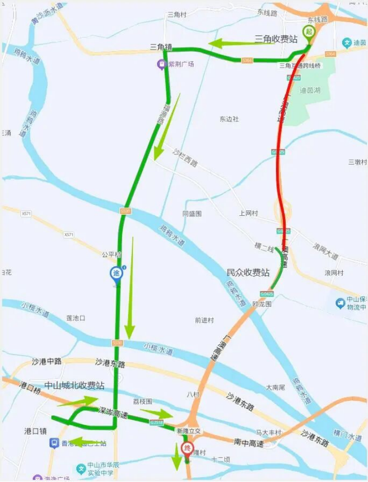 ①南行往珠海方向的车辆绕行路线:广澳高速三角收费站出高速路→南三公路→福源路→三角快线→中山城北收费站进入中江高速(深圳方向)→新隆互通进入广澳高速。