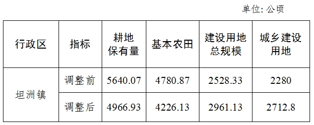 中山市坦洲镇规划调整完善前后主要指标对比表