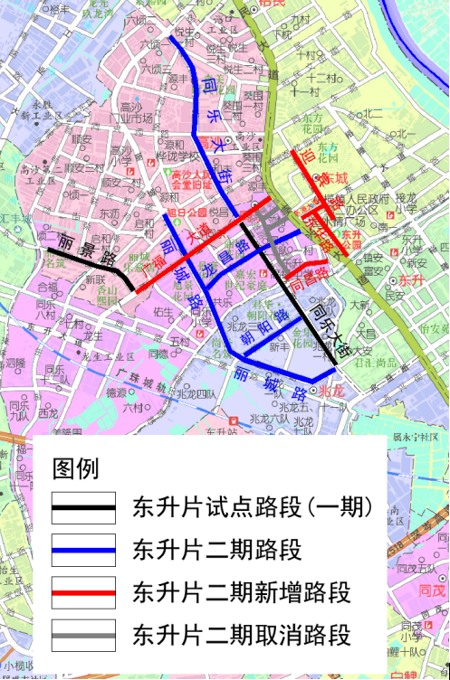 东升片二期项目现阶段共涉及9条路段,共1216个停车泊位(暂定,最终以政府主管部门批准的执行),路段明细和示意图如下:
