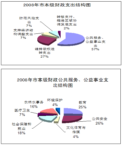 根据2008年市本级财政一般预算支出计划,市本级财力用于公共服务、公益事业支出占57%,用于维持政权运转支出占27%,用于防范风险支出占7%,用于支持经济结构调整支出占7%,用于转移支付、推进区域协调发展支出占2%。