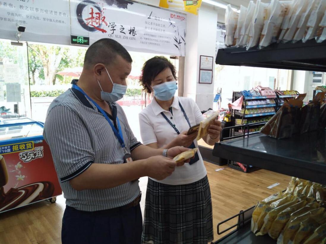 ▲检查组查看校内食品小卖部售卖的糕点
