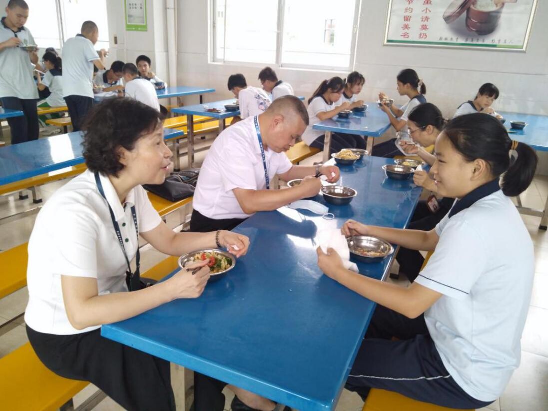 ▲检查组在东凤穗成新徽学校自费“陪餐”并详细询问学生在校用餐情况