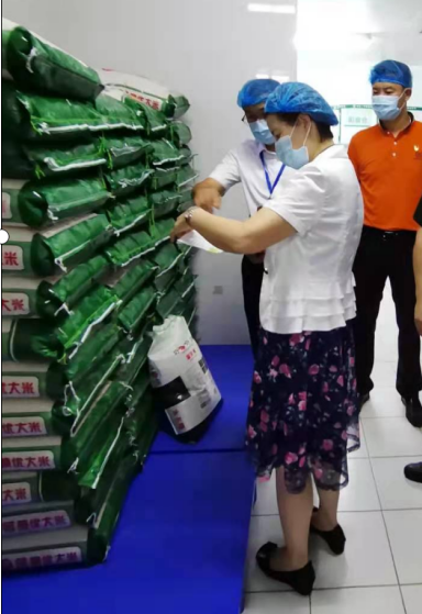 ▲检查组查看西区铁城中学大米索票索证情况