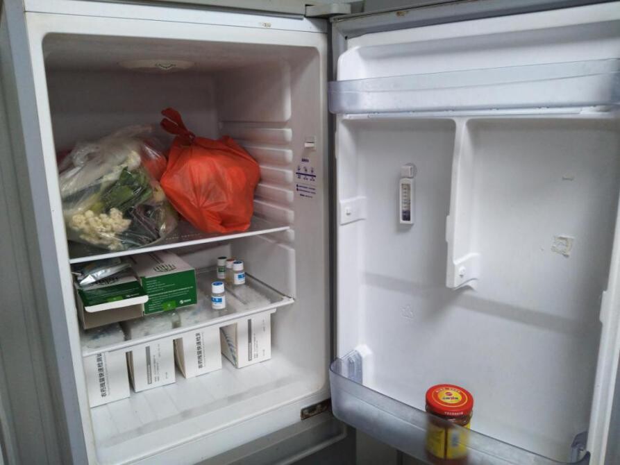 ▲美洋餐饮公司试剂与检测样品保存冰箱存放员工私人物品并用有色胶带存放样品