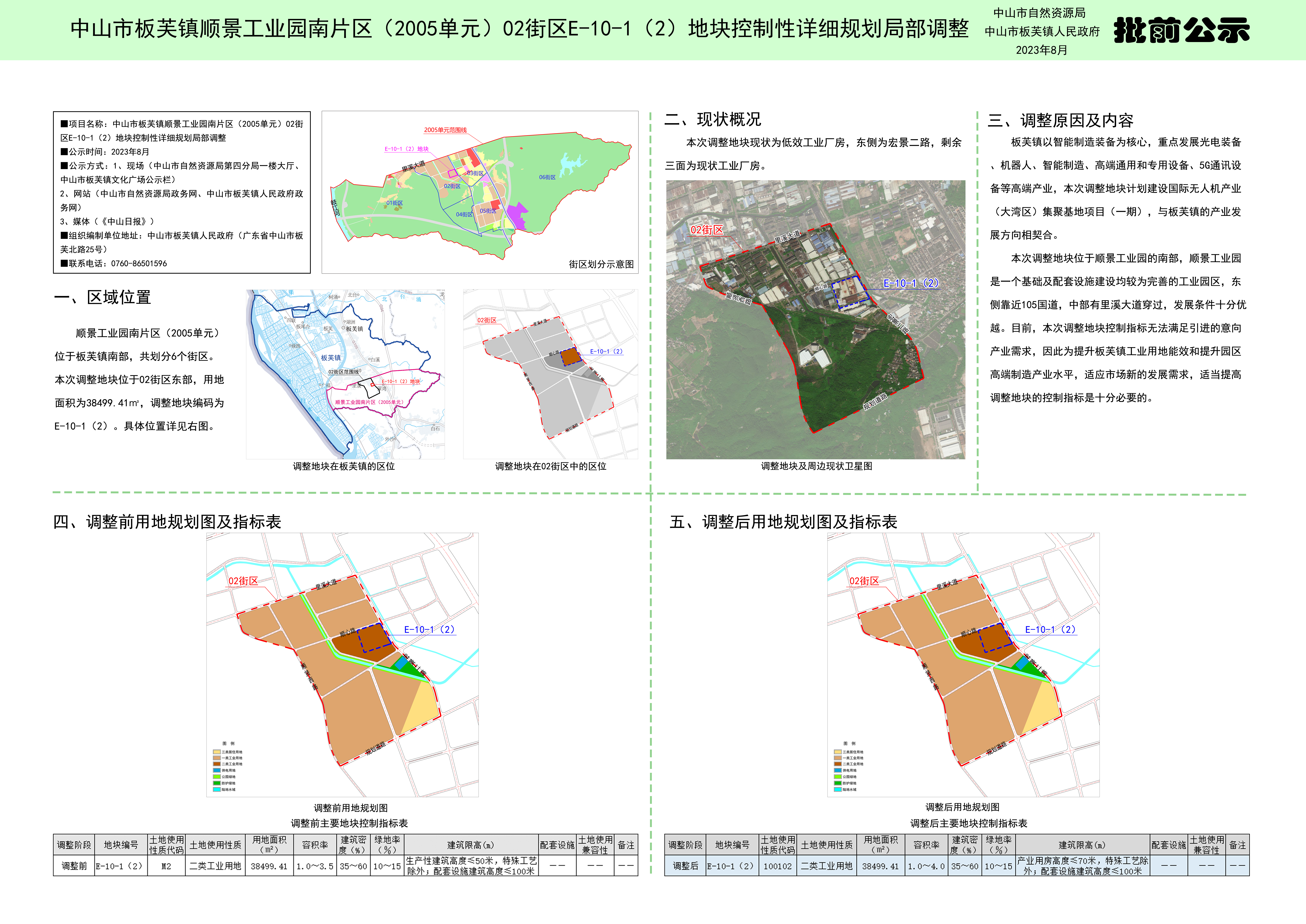 关于《中山市板芙镇顺景工业园南片区(2005单元)02街区E-10-1(2)地块控制性详细规划局部调整》草案的公示