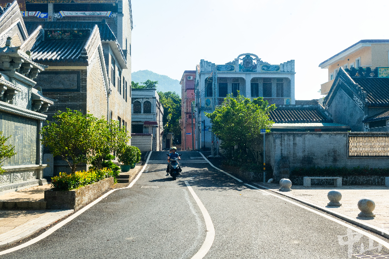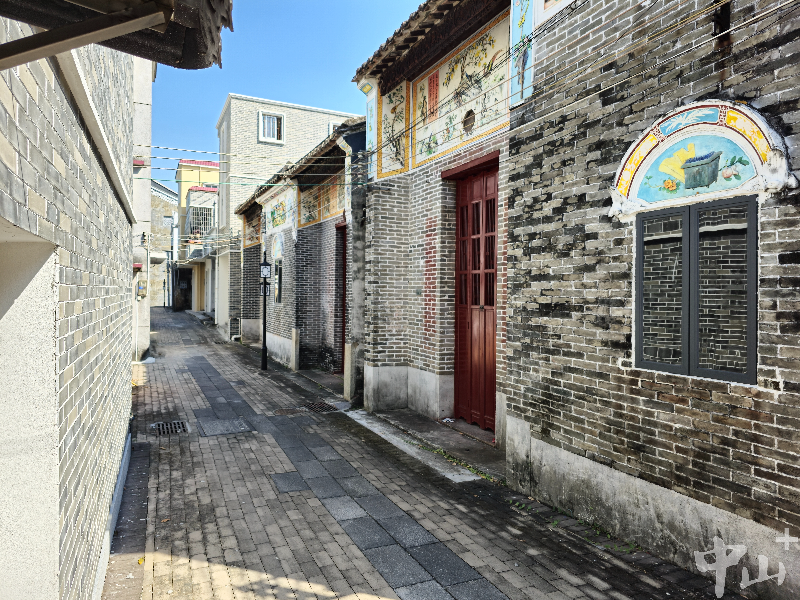 站在深湾村新围一街二巷,一座中西合璧的侨房引人驻足,这是一座中山市历史建筑,房屋的主人是一名美国华侨。修葺一新的淡黄色外墙和建筑原有的镂空雕花、色彩分明的装饰画等一起,让这座历经了120多年风雨的侨房散发出古朴雅致的韵味。