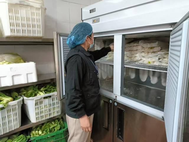 执法工作人员深入校园饭堂食品原料仓库、冷冻食品区域等进行检查,针对米面粮油、冻品冻肉等食材进行严格审查,检查相关食品的生产日期、保质期、包装完整性以及食品标签标识,确保其处于规定的保质期内且储存条件符合标准;对相关食品的送货单、供应商资质材料、相关产品检验合格报告、产品进货采购查验记录进行全面核查,确保所有冷冻食品来源可溯、去向可追,严格把控冷冻食品的安全。同时,对冷冻设备的运行状况进行检查,详细查看温度显示、制冷效果以及设备维护数据,确保冷冻设备正常稳定运行,持续提供符合标准的低温储存环境。