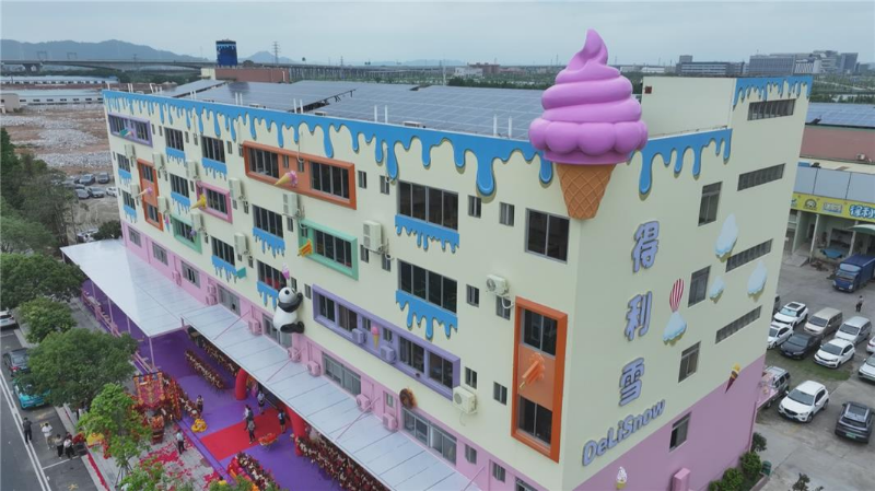 在板芙镇工业大道上,一座色彩斑斓、洋溢着甜蜜气息的冰淇淋城堡跃然眼前,让人忍不住想进里面探寻一番。它是由得利雪投资兴建的中山首个以冰淇淋为主题的亲子研学工业旅游项目,该项目于当天正式开门迎客。据了解,该项目依托得利雪20多年的冰淇淋研发生产经验,打造出集文化传承、科技展示、产业赋能于一体的复合型文旅空间。多项特色体验项目,让游客沉浸式感受冰淇淋文化的独特魅力。