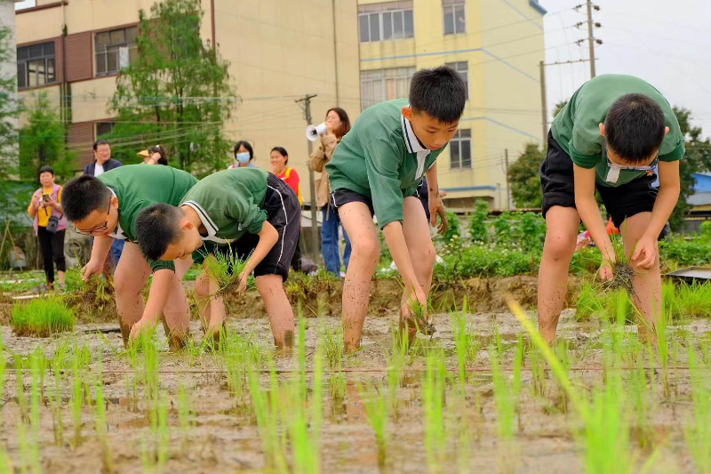 当日,亲子家庭到达“五育”基地的第一站是水稻种植基地。在老师和工作人员深入浅出的讲解中,学生们了解了水稻的由来及种植方法。随后,在专业种植人员的示范引导下,学生们纷纷挽起裤管,脚踩黄泥,下田种植水稻,体验劳动的辛苦与快乐。