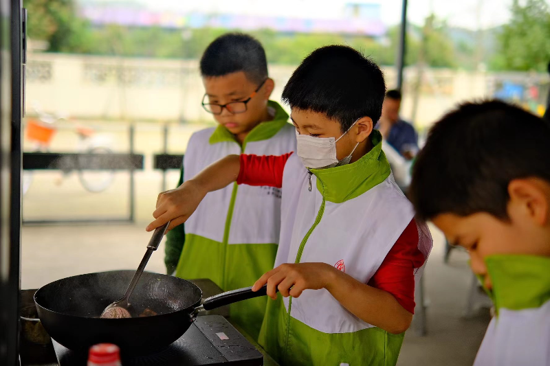 中午时分,在烹饪课程环节,学生们被分成4人一小组,分工进行洗菜、切菜、炒菜和摆盘等工作。在家长和老师的协助下,一道道香飘诱人、美味可口的佳肴陆续出锅。