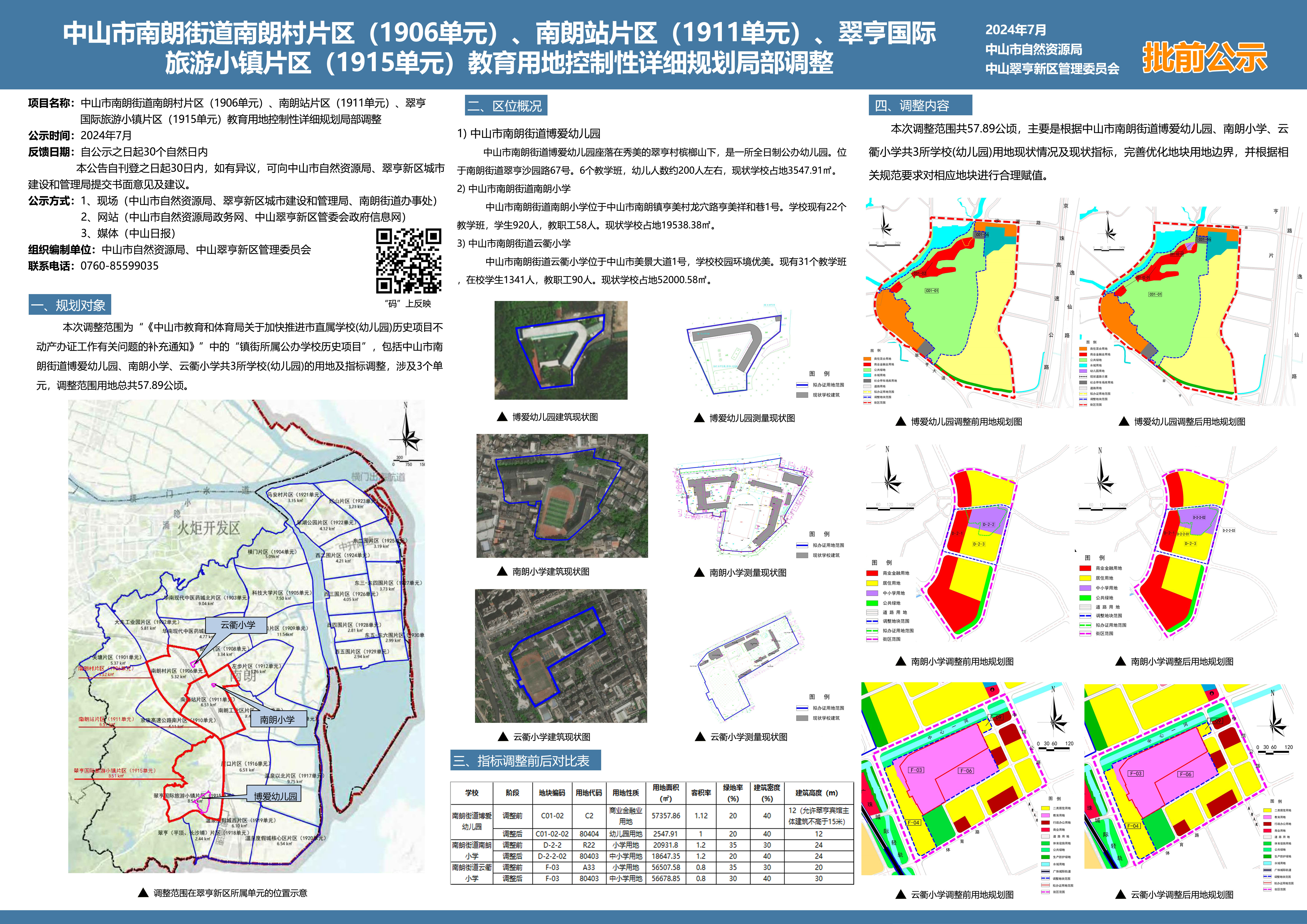 《中山市南朗街道南朗村片区(1906单元)、南朗站片区(1911单元)、翠亨国际旅游小镇片区(1915单元)教育用地控制性详细规划局部调整》草案已编制完成。根据《中华人民共和国城乡规划法》等相关法规要求,现对该草案予以公示。