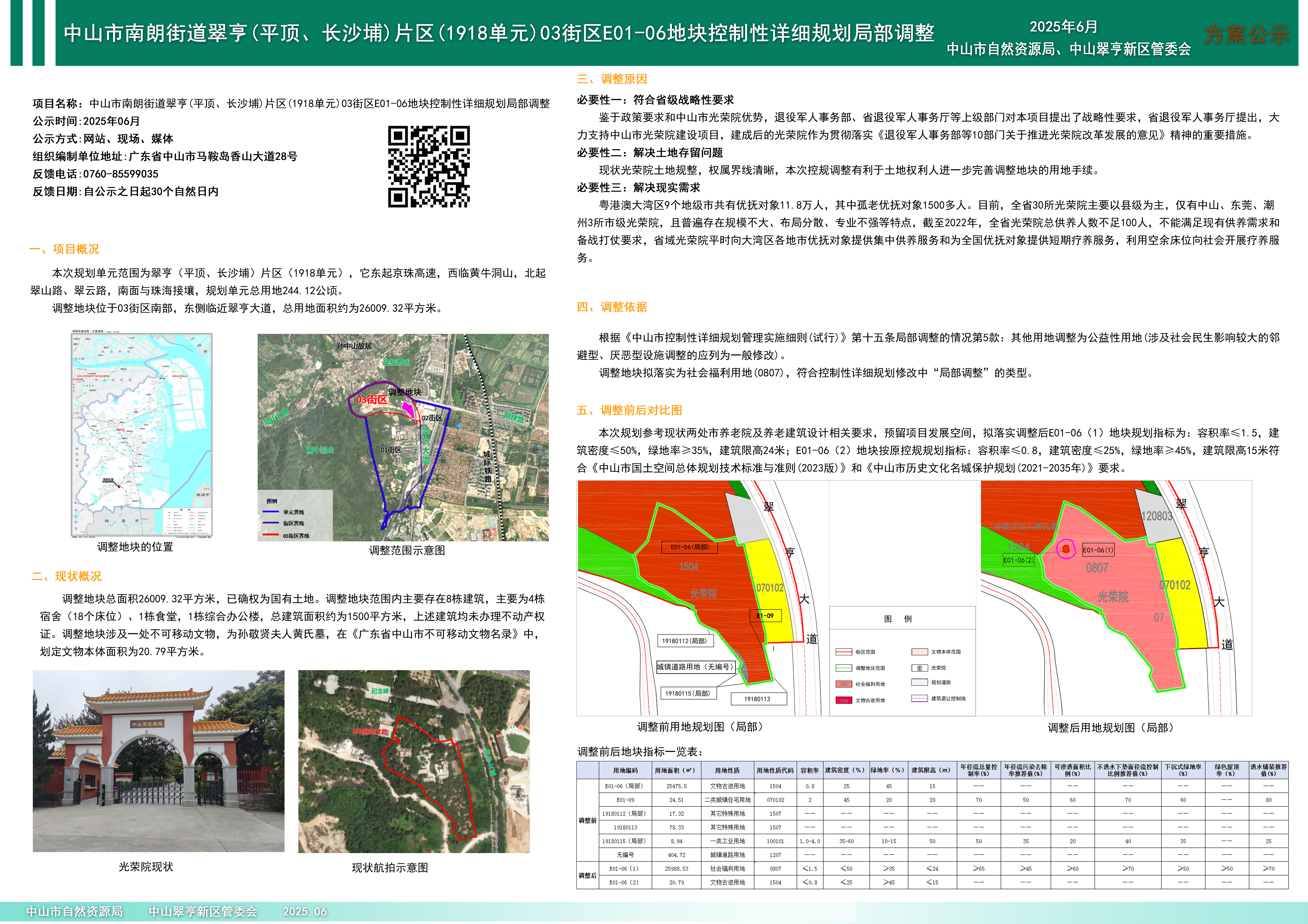 《中山市南朗街道翠亨(平顶、长沙埔)片区(1918单元)03街区E01-06地块控制性详细规划局部调整》草案已编制完成。根据《中华人民共和国城乡规划法》等相关法规要求,现对该草案予以公示。