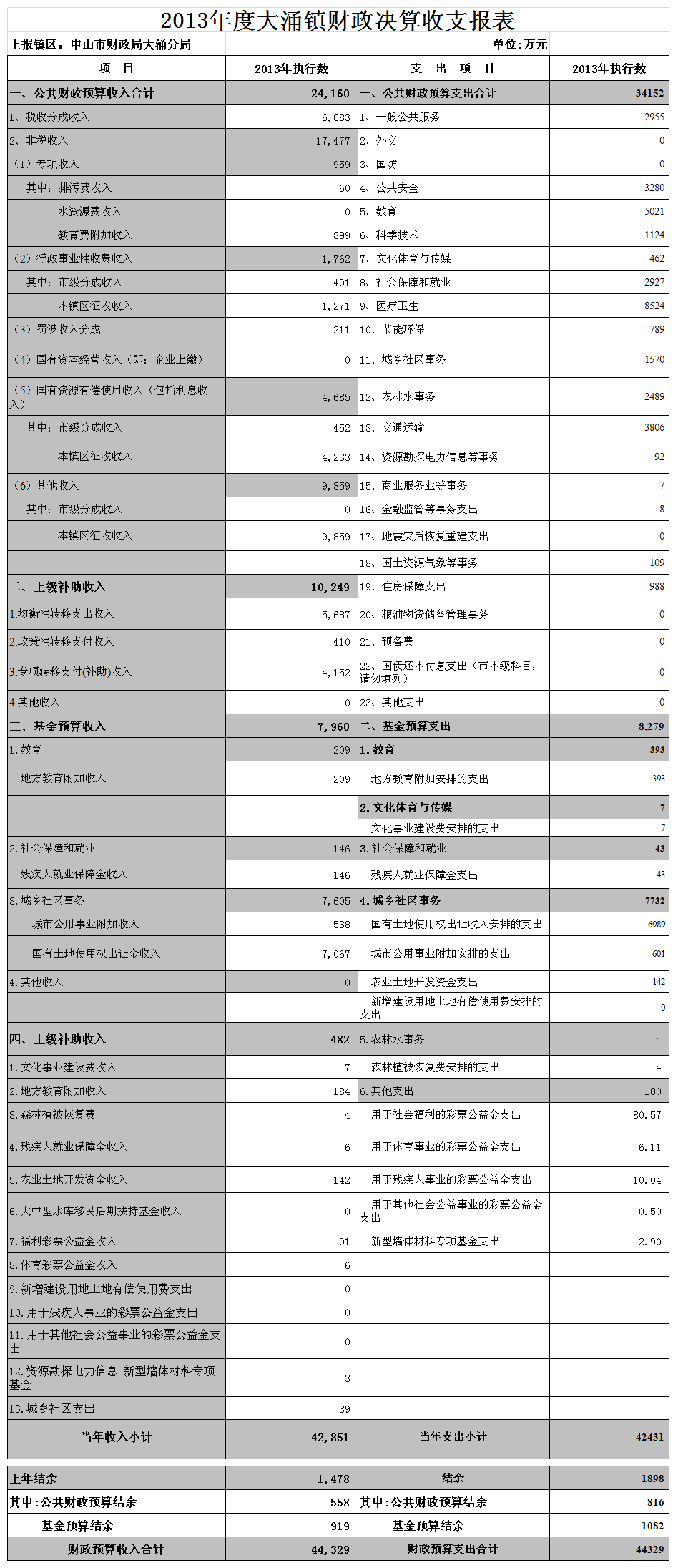 2013年度可支配公共财政预算收入3.5亿元,减去公共财政预算支出3.42亿元,滚存结余816万元,实现了收支平衡,略有结余。