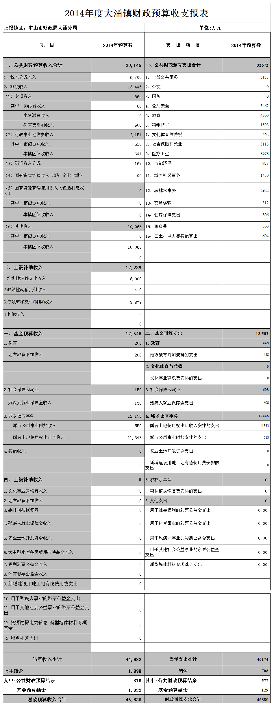2014年我镇当年财政预算总收入目标为4.5亿元,按照《预算法》的规定和量入为出、收支平衡的原则,财政预算总支出相应安排4.62亿元,加上年初结余1898万元,2014年预算年末滚存结余706万元。