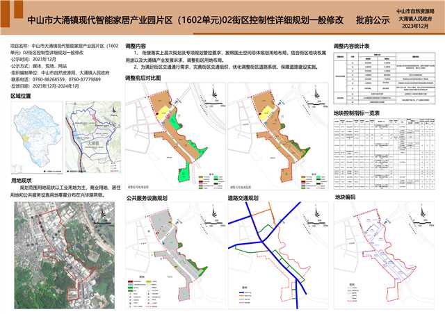 《中山市大涌镇现代智能家居产业园片区(1602单元)02街区控制性详细规划一般修改》草案已编制完成。根据《中华人民共和国城乡规划法》等文件要求,现对该草案予以公示。