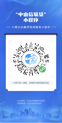 中山市信易贷综合服务平台是中山市维一的市级融资信用服务平台,为经营主体提供融资政策资讯、多样化信贷产品、融资需求对接、融资咨询热线、信用状况查询、信用修复等多元化、一站式优质服务。扫描下方二维码可进入体验“信易贷”和“信用+”服务。