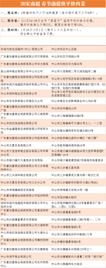 近日,市发展改革局发文,要求中山市农副产品价格调控项目库发挥价格风向标作用,推动全市32家市农副产品价格调控项目库项目单位参与稳价惠民工作,保持今年春节期间市场重要农副产品价格的基本稳定。其中,分布在各镇街的30家商超将在1月28日-2月1日为市民提供平价肉菜。