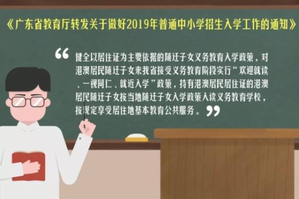 省教育厅要求各地要进一步完善义务教育学校招生入学政策,根据《教育部办公厅关于贯彻落实〈港澳台居民居住证申领发放办法〉的通知》有关要求,科学制定2019年义务教育学校招生入学政策,对港澳居民子女在湾区内就读义务教育阶段学校实行“欢迎就读,一视同仁,就近入学”政策。持有港澳居民居住证的港澳人士随迁子女,可按当地制定的随迁子女入学政策入读义务教育学校。