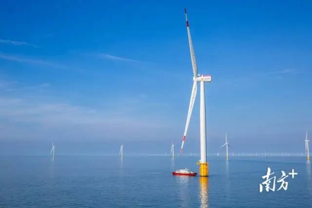 叶片起吊、风机矗立。广东正规模化开发海上风电,推动项目集中连片开发利用,打造粤东、粤西千万千瓦级海上风电基地,支撑可再生能源快速发展。