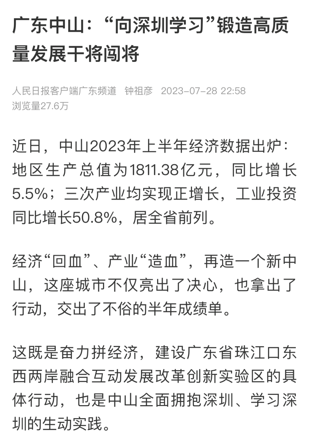 编者按:全面拥抱深圳、向深圳学习,是中山积极参与粤港澳大湾区建设、推动高质量发展的必然选择。近年来,深中两地融合发展步伐加快提速,中山更是抓住干部这个关键,通过多种形式推动各个层面以深圳为标杆,学习一流,对标一流、跟上一流,形成了干事创业浓厚氛围。7月28日,人民日报新闻客户端推出长篇报道,重点聚焦中山向深圳学习、锻造高质量发展干将闯将、为“再造一个新中山”提供强大组织保障的生动实践。