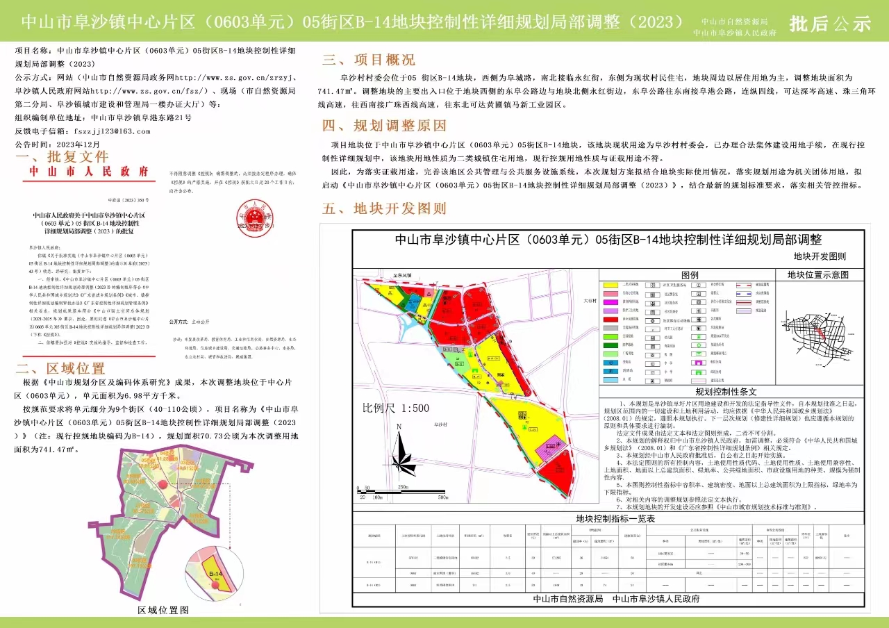 《中山市阜沙镇中心片区(0603 单元)05街区B-14地块控制性详细规划局部调整》(2023)已于2023年12月19日经51黑料 批复,根据《中华人民共和国城乡规划法》《广东省城乡规划条例》等相关法律、法规要求予以公示。有关规划成果信息可在市自然资源局网站(//51hltop.com/zrzyj)和阜沙镇人民政府网站(//51hltop.com/fsz)查询。