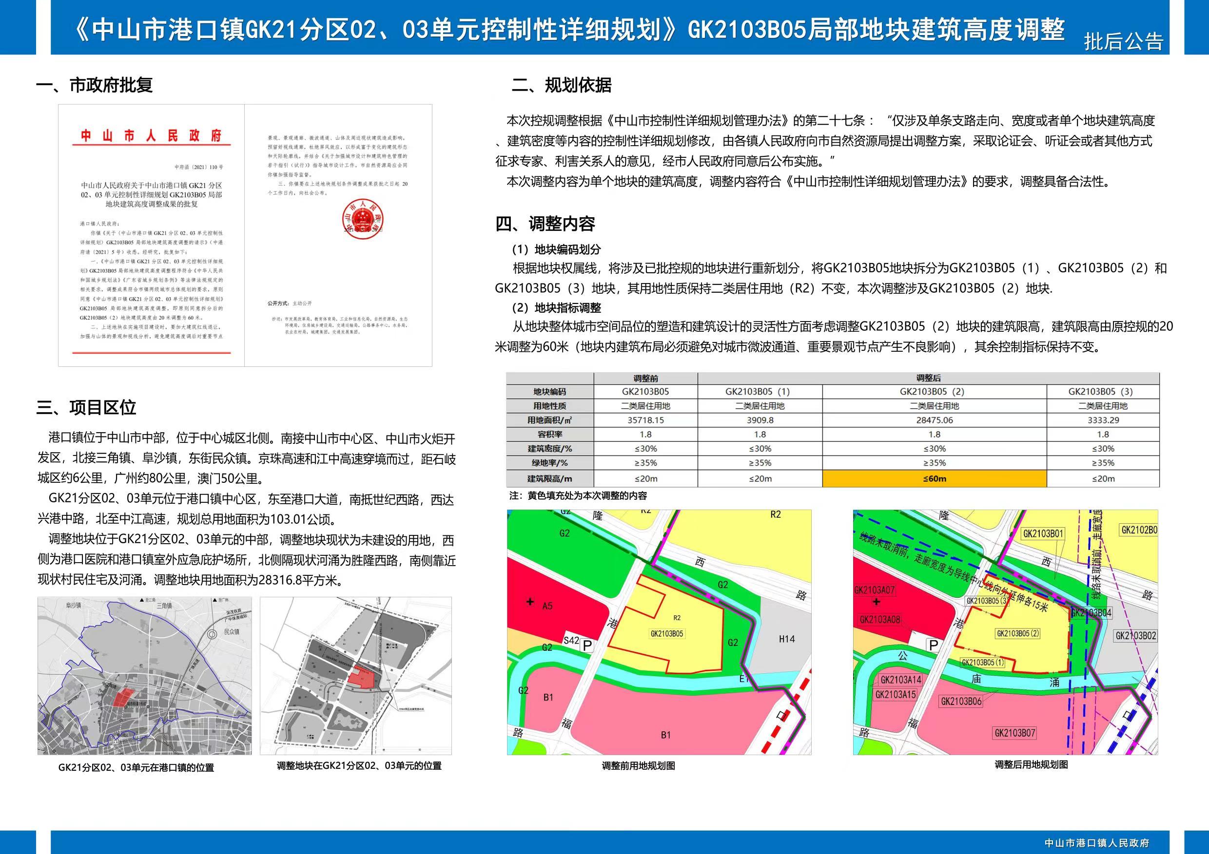 《中山市港口镇GK21分区02、03单元控制性详细规划》GK2103B05局部地块、《港口镇大丰工业区控制性规划修编(京珠高速以东)》B-01-08局部地块、《中山市港口镇大丰工业园控制性详细规划修编(京珠高速以东)》B-02-29局部地块建筑高度调整经51黑料 批准实施,批复文号分别为中府函〔2021〕110号、中府函〔2021〕116号、中府函〔2021〕132号。现根据《中华人民共和国城乡规划法》等相关法规要求予以批后公告,欢迎社会公众查询、监督实施。