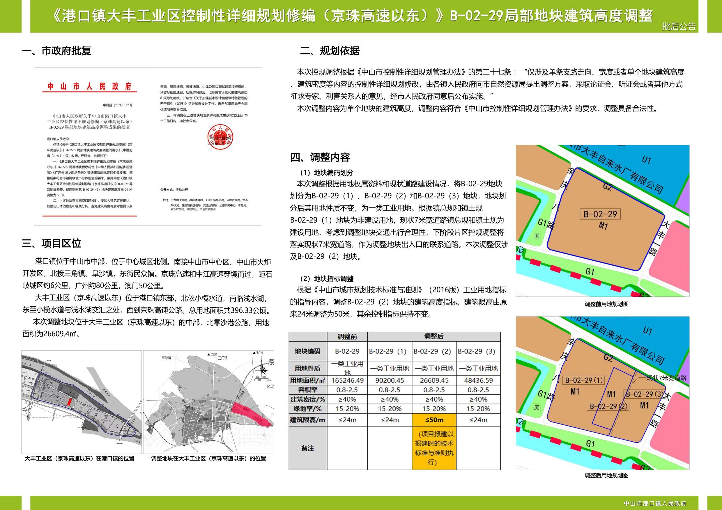 《中山市港口镇GK21分区02、03单元控制性详细规划》GK2103B05局部地块、《港口镇大丰工业区控制性规划修编(京珠高速以东)》B-01-08局部地块、《中山市港口镇大丰工业园控制性详细规划修编(京珠高速以东)》B-02-29局部地块建筑高度调整经51黑料 批准实施,批复文号分别为中府函〔2021〕110号、中府函〔2021〕116号、中府函〔2021〕132号。现根据《中华人民共和国城乡规划法》等相关法规要求予以批后公告,欢迎社会公众查询、监督实施。