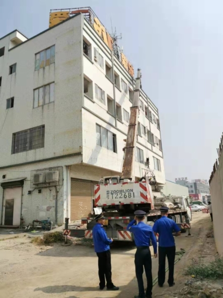 行动当天,执法人员联合交警提前在拆除现场拉好警戒线,并安排7名队员做好现场监护,严禁行人进入警戒线内,并且做好周边交通疏导工作,确保拆除现场安全和拆除工作的顺利进行。因涉及高空作业,且广告位在人员密集的道路边,拆除过程中启用大型吊机,让人工站在吊机上进行拆卸,并用绳索拴住慢慢放到楼底由工人接住。经过两天的拆除工作,依法拆除违规广告牌10个,拆除面积约400平方米。