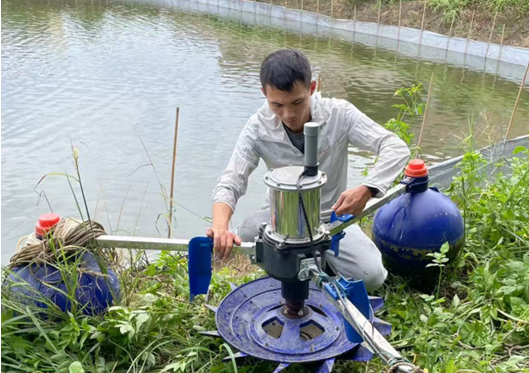 7月23日,三角供销社工作人员为社员养殖基地开展增氧机维修服务。