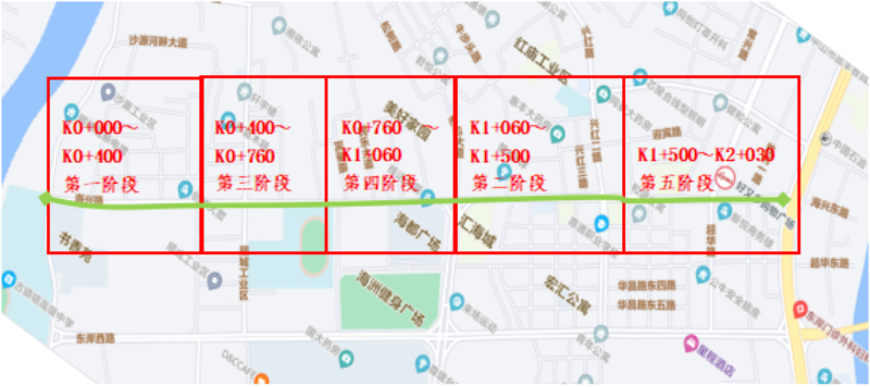 本次道路改造将分五阶段全封闭进行,道路改造总工期:自2026 年 1 月 起,预计至 2027 年 2月止(具体工期将根据各阶段施工进度进行动态调整),各阶段分段如下图: