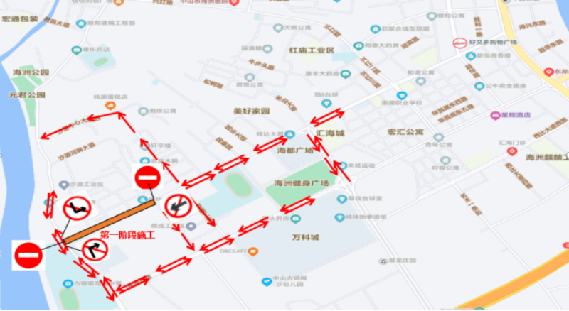 西岸北路往返海兴路方向双向封闭,需绕行东岸西路及沙源工业区方向等道路。请过往车辆按现场交通指示标志减速慢行或提前选择绕道行驶,请广大驾驶员相互知照,提前选择行车路线。