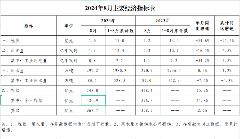 古镇镇2024年8月主要经济指标表