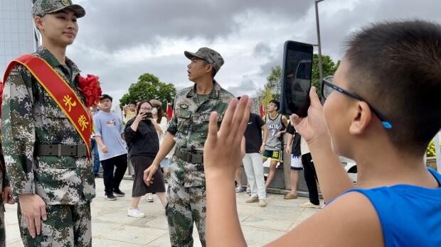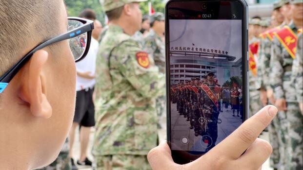 欢送会现场男孩为即将入伍的新兵表哥拍照