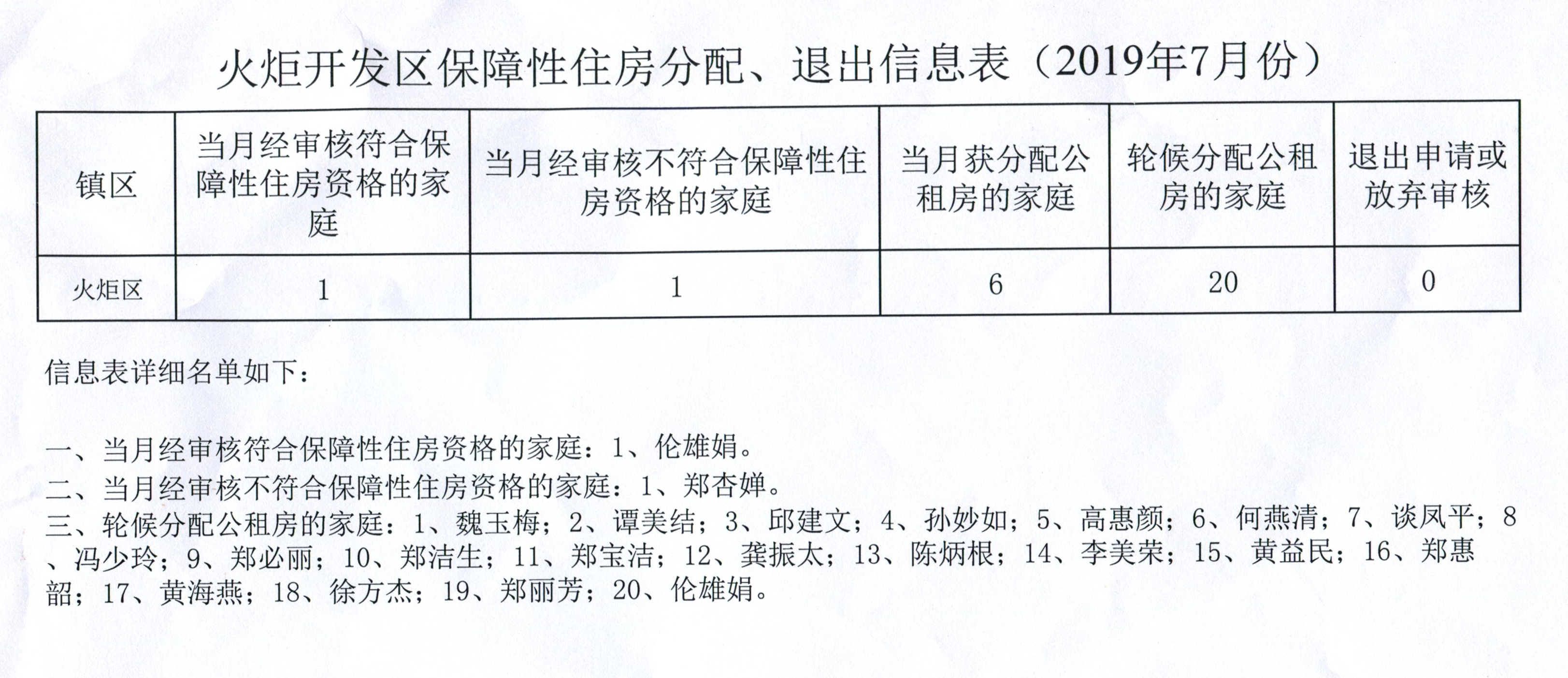 火炬开发区保障性住房分配、退出信息表(2019年7月份)
